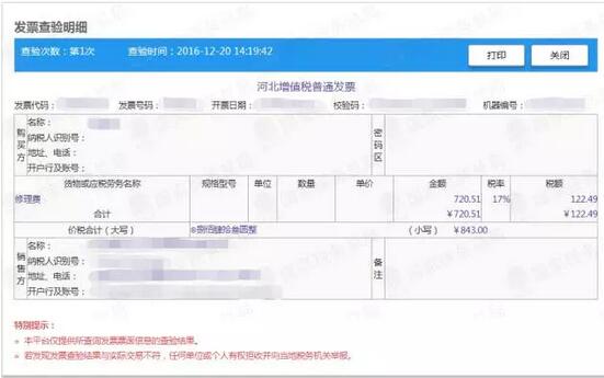 特別提示:《中華人民共和國(guó)發(fā)票管理辦法》規(guī)定:不符合規(guī)定的發(fā)票,不得作為財(cái)務(wù)報(bào)銷(xiāo)憑證,任何單位和個(gè)人有權(quán)拒收。付款方取得發(fā)票后應(yīng)及時(shí)核對(duì)發(fā)票開(kāi)具內(nèi)容是否真實(shí)、項(xiàng)目填寫(xiě)是否齊全、加蓋的發(fā)票專(zhuān)用章是否與收款方一致。對(duì)于違反發(fā)票管理法規(guī)的行為,任何單位和個(gè)人有權(quán)舉報(bào)。