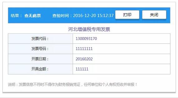 (2)發(fā)票狀態(tài)為作廢:納稅人輸入的發(fā)票校驗(yàn)信息與稅務(wù)機(jī)關(guān)電子信息一致,但發(fā)票已被發(fā)票開(kāi)具方做作廢處理,此發(fā)票不可作為財(cái)務(wù)報(bào)銷(xiāo)憑證。