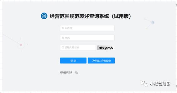二、使用說明。1.打開經(jīng)營范圍規(guī)范表述查詢系統(tǒng),如下圖1:可使用用戶名、密碼及驗證碼登錄軟件(用戶名:111,密碼:123456);也可點擊“以申請人身份登錄”直接進入軟件。