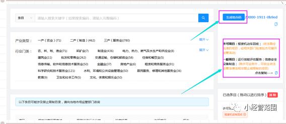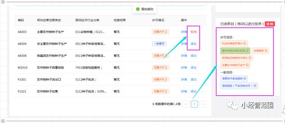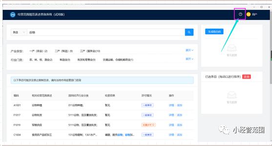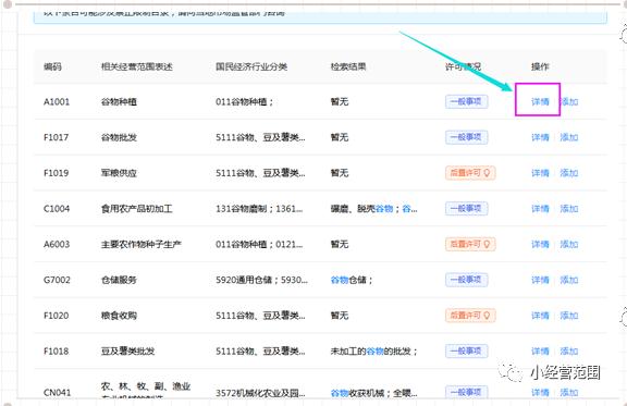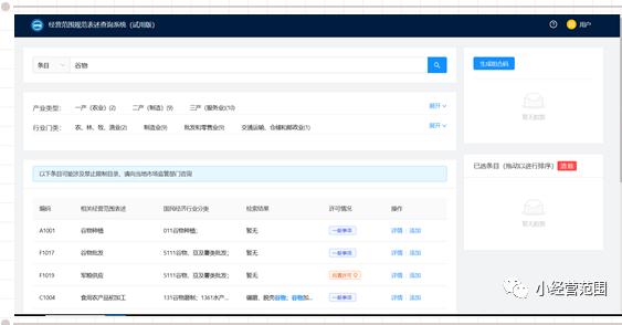 (3) 經(jīng)營范圍查詢結果顯示區(qū):第一是經(jīng)營范圍對應唯一編碼;第二是相關經(jīng)營范圍表述;第三是此經(jīng)營范圍對應的國民經(jīng)濟行業(yè)分類;第四是搜索關鍵字在經(jīng)營范圍規(guī)范表述中中的檢索結果;第五是許可情況,直接顯示該項經(jīng)營范圍規(guī)范是否許可,分為前置許可、后置許可及一般事項;第六是操作按鈕,可點擊此項按鈕進行詳情查看,見下圖6: