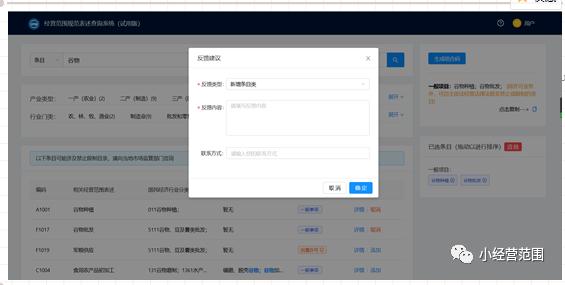 (5)對應《國民經(jīng)濟行業(yè)分類》行業(yè)。指經(jīng)營范圍規(guī)范條目對應的《國民經(jīng)濟行業(yè)分類》中的行業(yè)類別。(6)經(jīng)營范圍規(guī)范條目說明。指根據(jù)相關法律法規(guī)規(guī)定或《國民經(jīng)濟行業(yè)分類》標準及相關專業(yè), , , , 目錄對經(jīng)營范圍規(guī)范條目的簡要說明。(7)檢索結果:搜索關鍵字在經(jīng)營范圍規(guī)范表述中的檢索結果。(8)使用經(jīng)營范圍規(guī)范條目辦理登記的相關活動。指使用該條經(jīng)營范圍規(guī)范條目辦理登記的相關經(jīng)營活動內容,相關活動內容源自相關法律法規(guī)規(guī)定、《國民經(jīng)濟行業(yè)分類》注釋說明、相關專業(yè)目錄以及企業(yè)登記常用高頻詞匯。 (9)經(jīng)營范圍規(guī)范條目不包含的相關活動。指根據(jù)相關法律法規(guī)規(guī)定及相關專業(yè)目錄,不能使用該經(jīng)營范圍規(guī)范條目辦理登記的相關活動內容。(10)備注。指該條經(jīng)營范圍規(guī)范表述條目涉及到的《外資負面清單》、“多證合一”改革事項等相關內容。(12)政策法規(guī)。經(jīng)營范圍規(guī)范條目所涉及到的政策法規(guī)目錄。