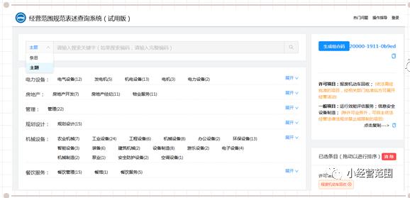 申請人可通過復制組合碼獲取經(jīng)營范圍規(guī)范化表述。8.系統(tǒng)提供了通過“主題”的方式批量查詢經(jīng)營范圍條目的功能,使用者可以點擊搜索框左方的箭頭,選擇“主題”條目。如下圖13: