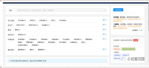 9.系統(tǒng)將列出部分企業(yè)登記常用的行業(yè)特征,如“餐飲服務”“房地產(chǎn)開發(fā)”等,使用者可選擇其中某一具體項目,系統(tǒng)將列出與之相關的多項經(jīng)營范圍規(guī)范條目,如下圖14: